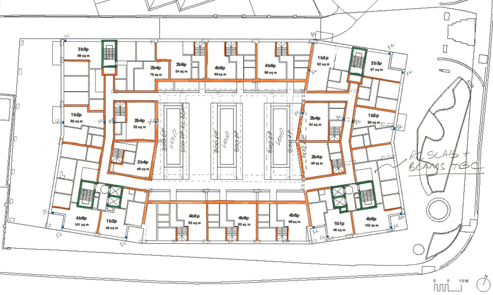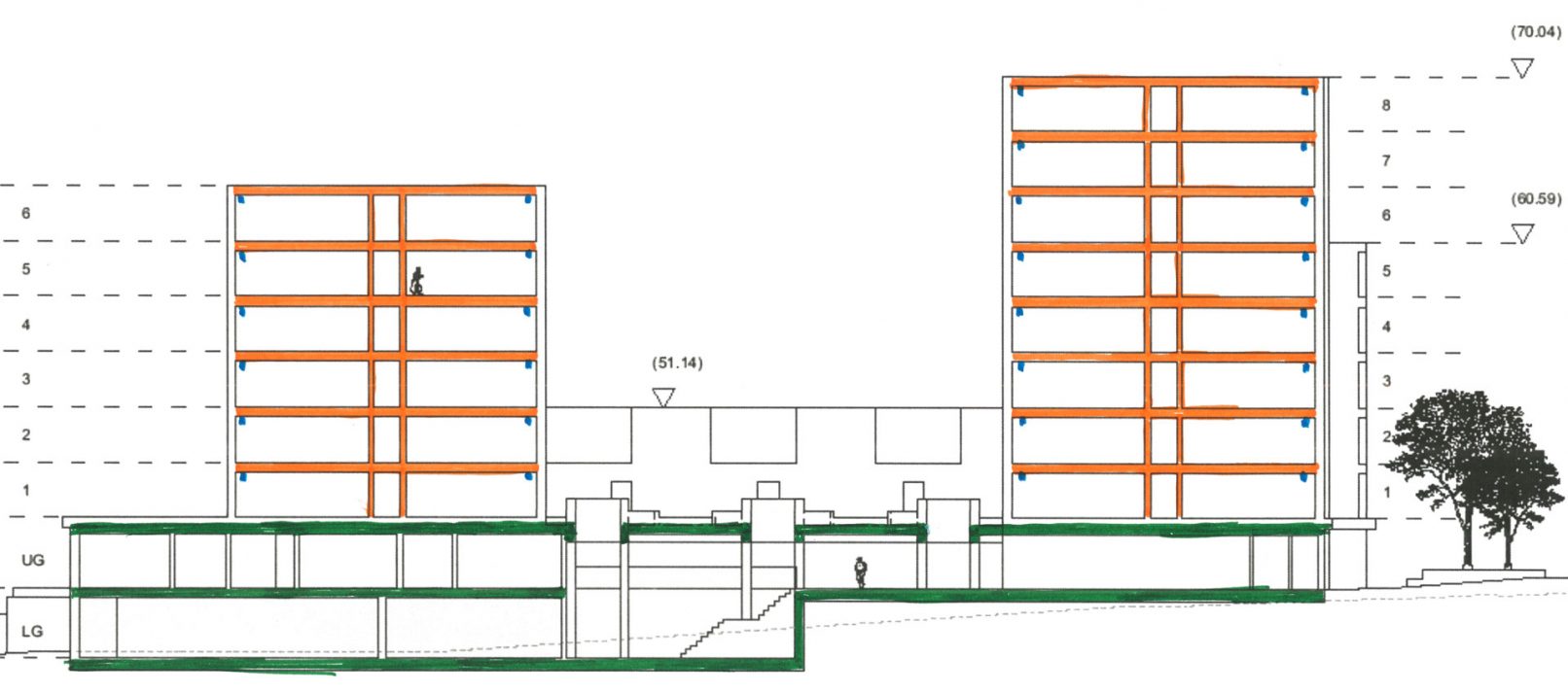 Reinforced concrete (RC) podium transfer slab and frame were used below first floor level, to achieve large structural offsets required for the changes of use.